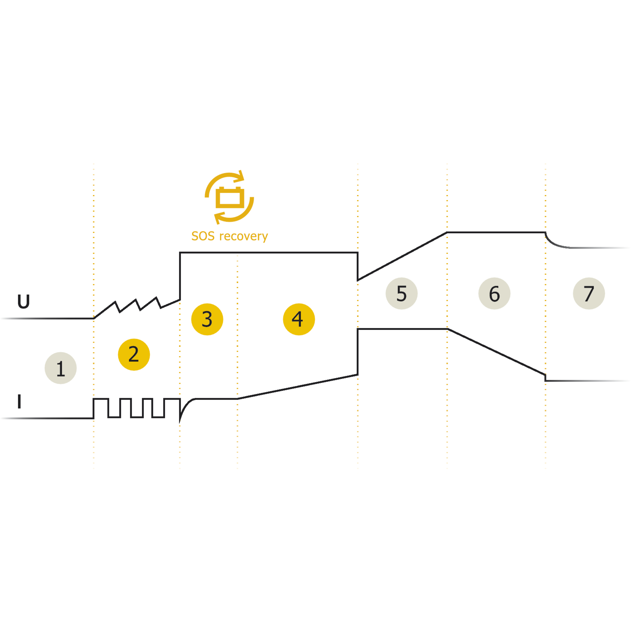 • The 7 step charging curve ensures maximum battery performance and longevity. • It can recover deeply discharged / sulfated batteries (SOS Recovery ).