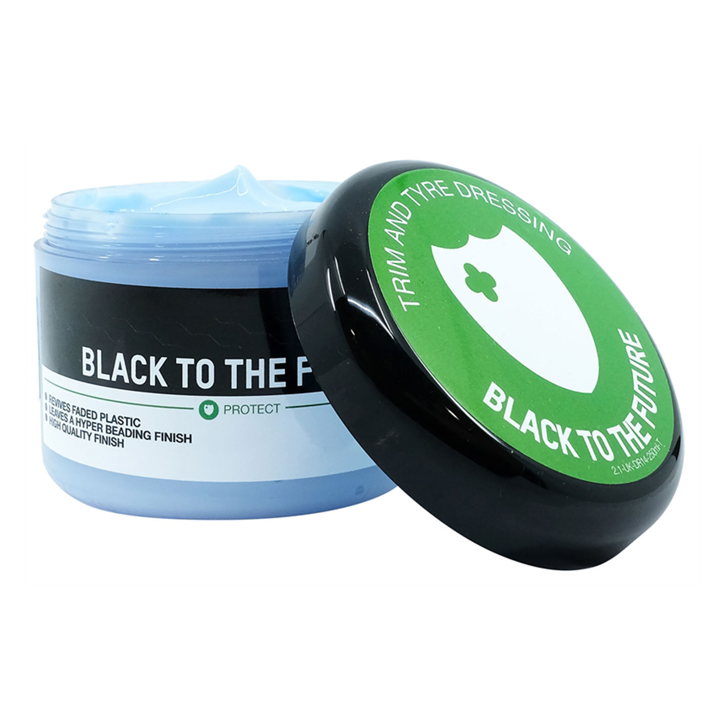 Black To The Future is a trim and tyre dressing in the form of a thick gel. It uses fortified polymers to restore and protect tyres and plastic trim for months at a time, regardless of weather. It revives faded plastics and holds the restored colour. It is designed to be used neat and can be applied to tyres for a show finish.
